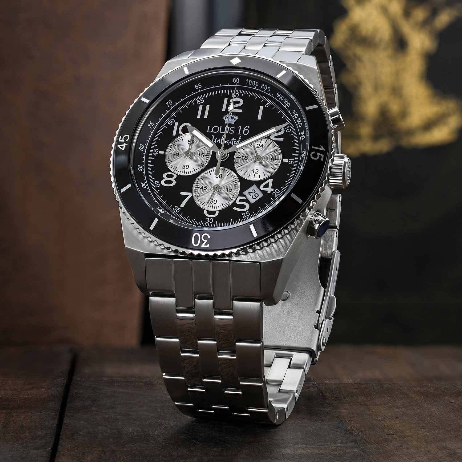 Die klaren Linien der Uhr erinnern an einen sportlichen Chronographen mit einer Stoppuhrfunktion, die Sekunden, Minuten und Stunden misst. Sie überzeugt an jedem Handgelenk – egal, ob man es sportlich oder elegant mag. Die Uhr passt sowohl zum Anzug als auch zum legeren Stil und beeindruckt mit ihrer nahezu perfekten Optik.