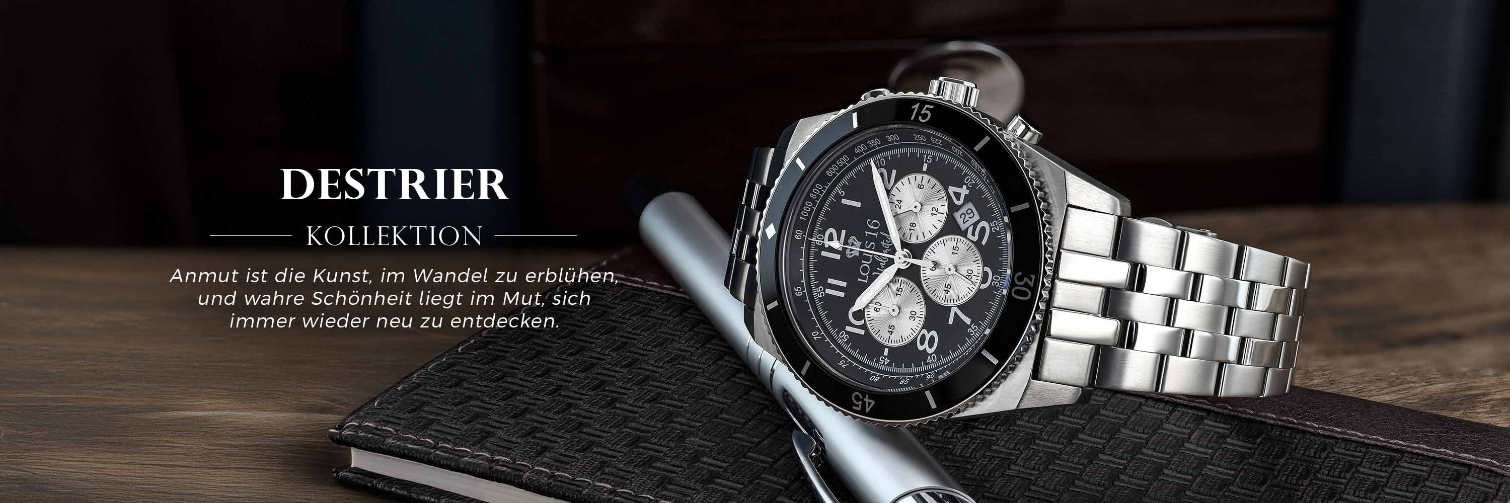 Destrier startet in die Kollektion mit den klassischen, beliebten Farbkombinationen: Gold-Schwarz, Bicolor-Schwarz und dem zeitlosen Silber-Schwarz. Wähle deine Farbe, stoppe deine Zeit und sei von nun an auch im Alltag stilsicher und modisch unterwegs.