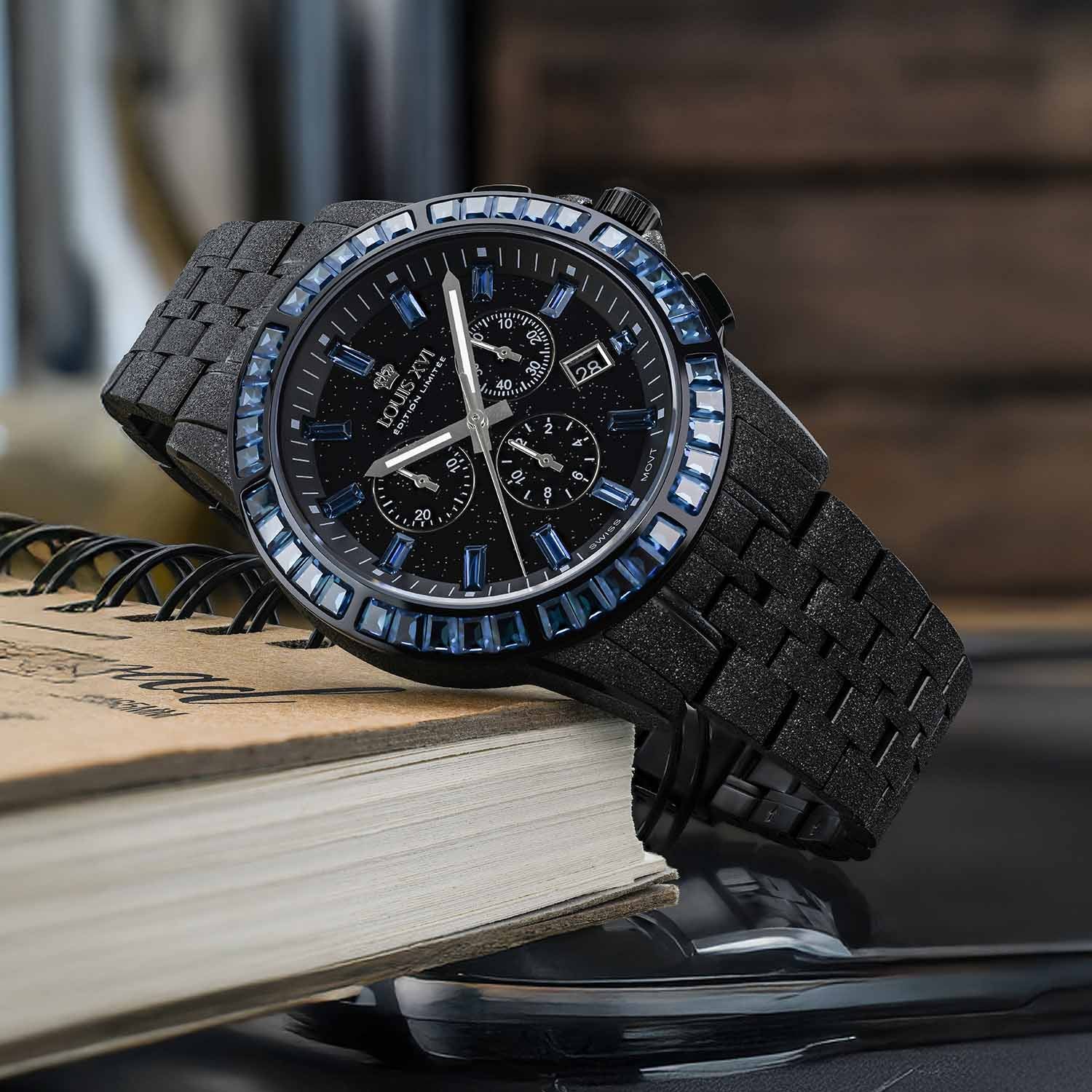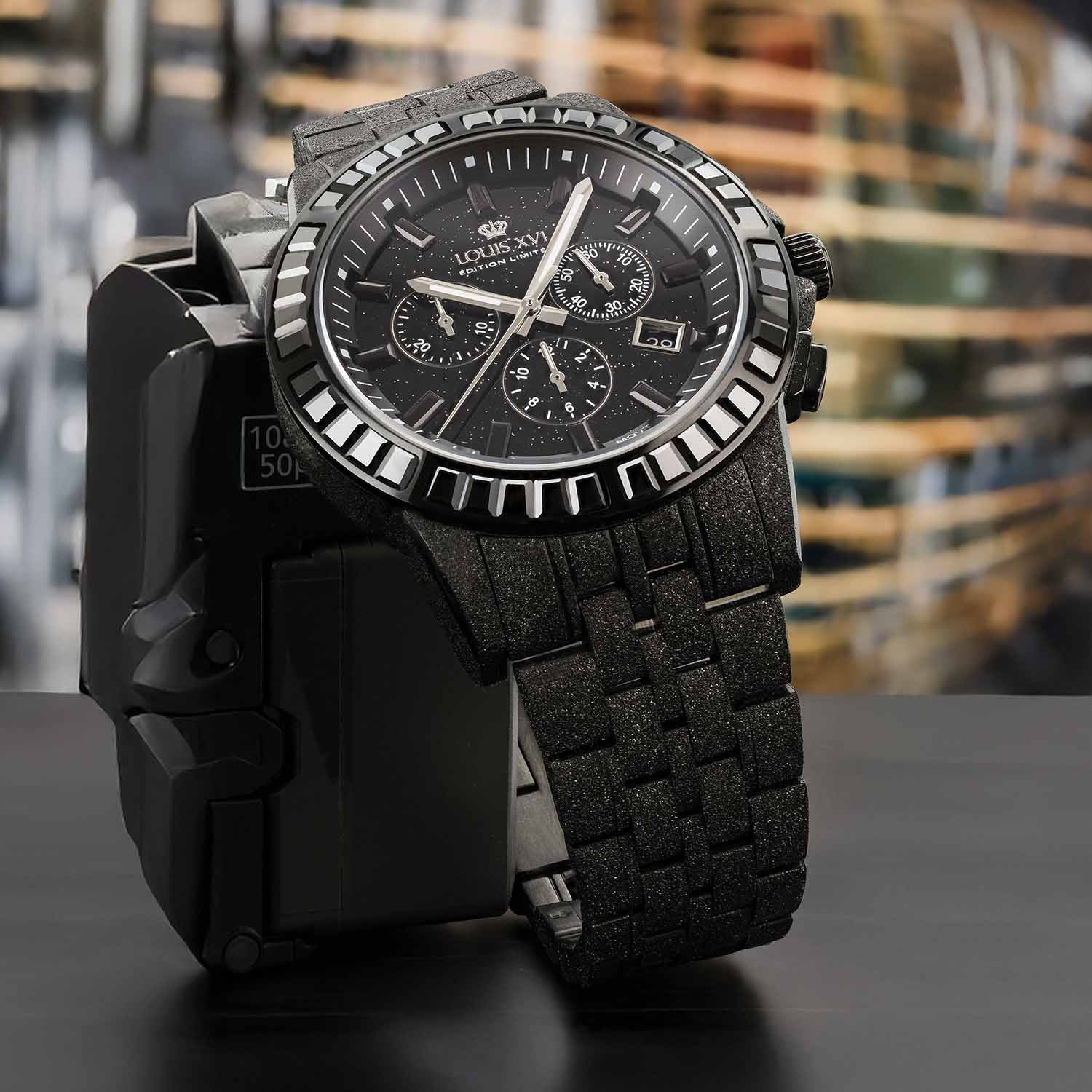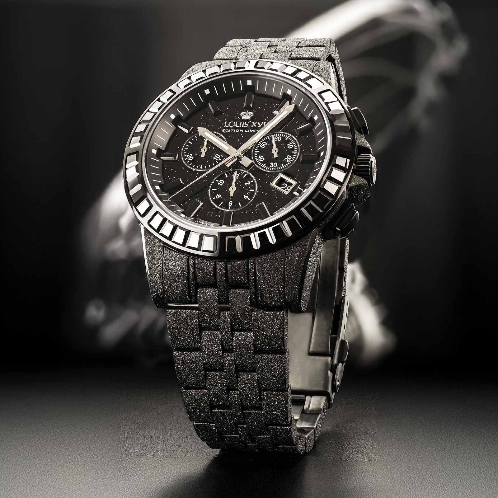 Durch feinstes Microhammering wird der Stahl veredelt und erhält eine matte Oberfläche, die die glänzende Schicht entfernt. Diese Bearbeitung macht ihn besonders kratzfest, da Gebrauchsspuren nahezu unsichtbar bleiben. Mit der abschließenden schwarzen PVD-Schicht wird daraus Black Frosted – eine Oberfläche, die die Tiefe von Schwarz mit der Eleganz funkelnder Eiskristalle vereint.