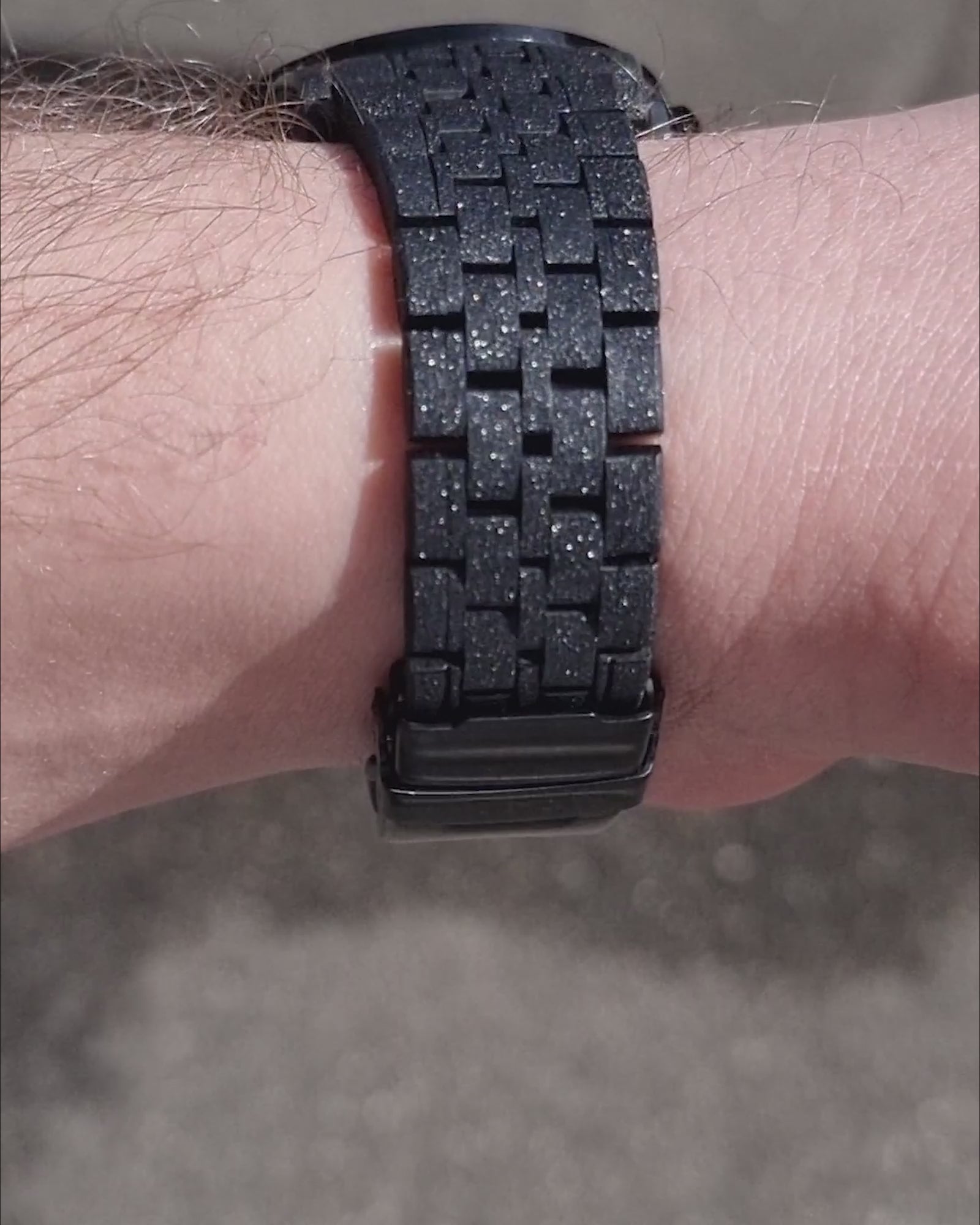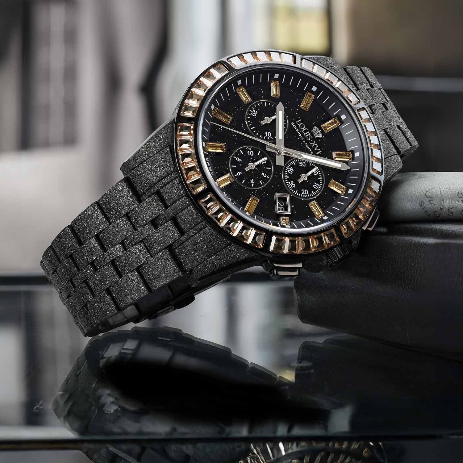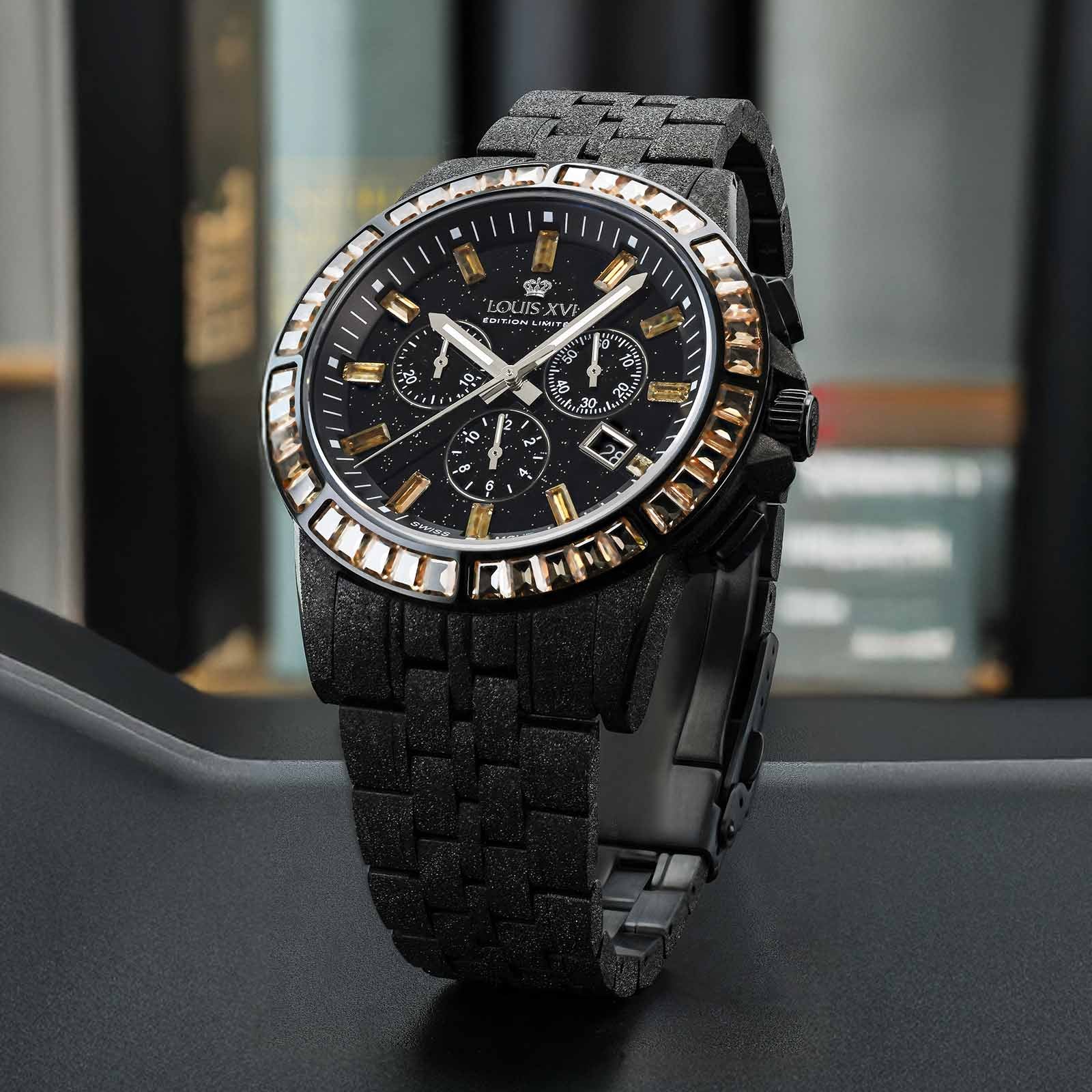 Durch feinstes Microhammering wird der Stahl veredelt und erhält eine matte Oberfläche, die die glänzende Schicht entfernt. Diese Bearbeitung macht ihn besonders kratzfest, da Gebrauchsspuren nahezu unsichtbar bleiben. Mit der abschließenden schwarzen PVD-Schicht wird daraus Black Frosted – eine Oberfläche, die die Tiefe von Schwarz mit der Eleganz funkelnder Eiskristalle vereint.