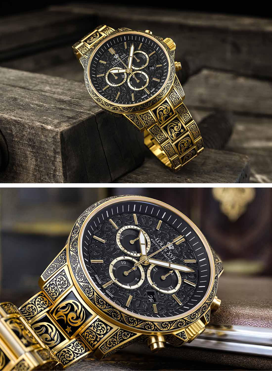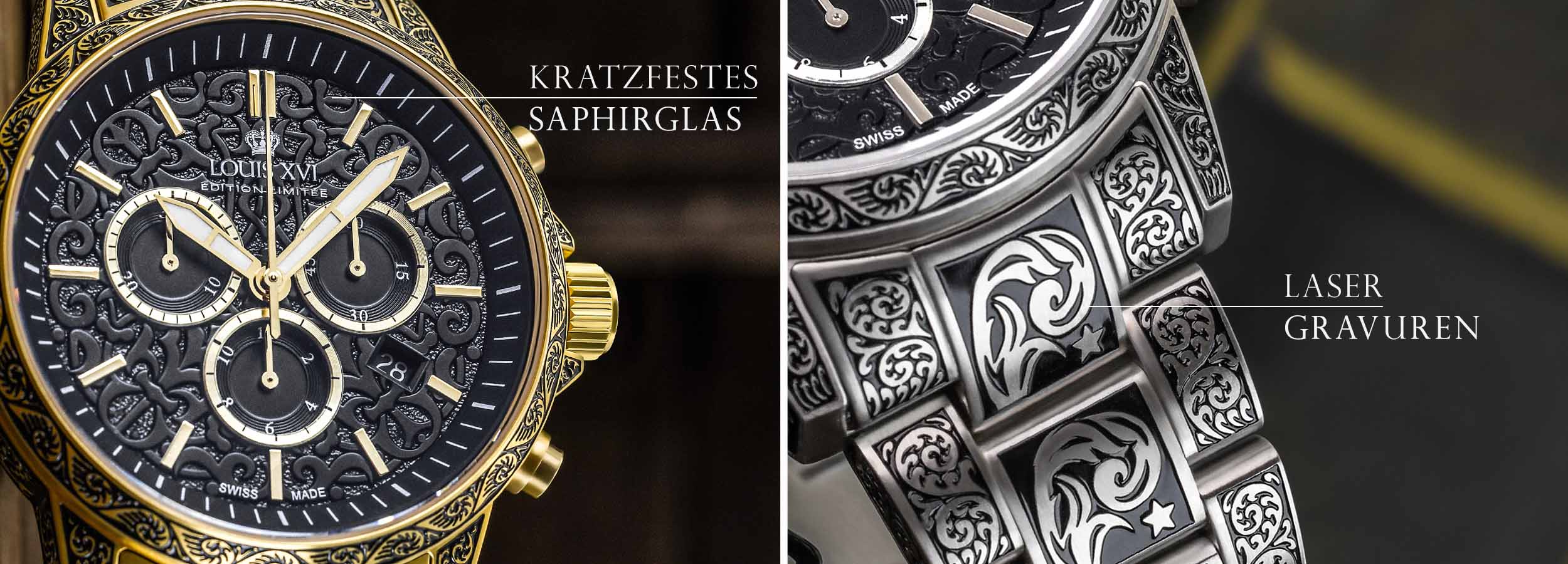 Der Prozess beginnt mit einer Lasergravur, bei der das Gehäuse der Uhr mit feinen und detaillierten Mustern versehen wird. Diese Gravuren schaffen Hohlräume auf der Oberfläche der Uhr, die später gefüllt werden.