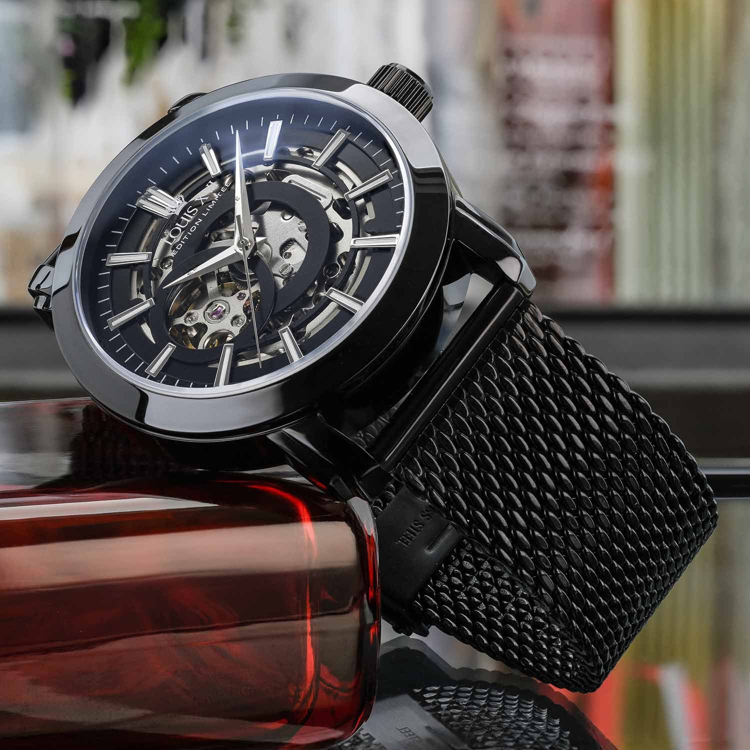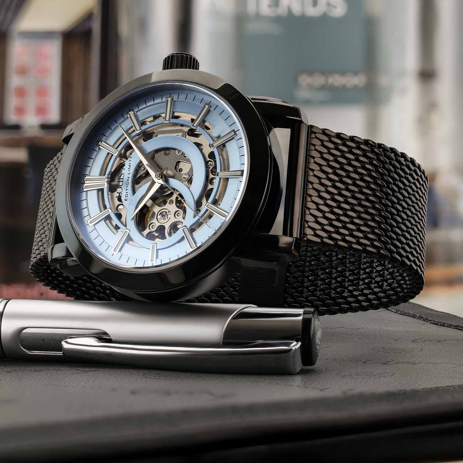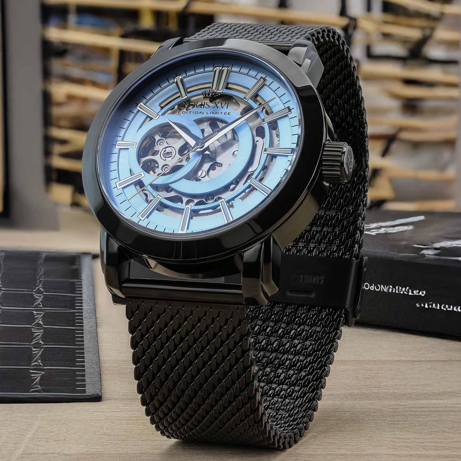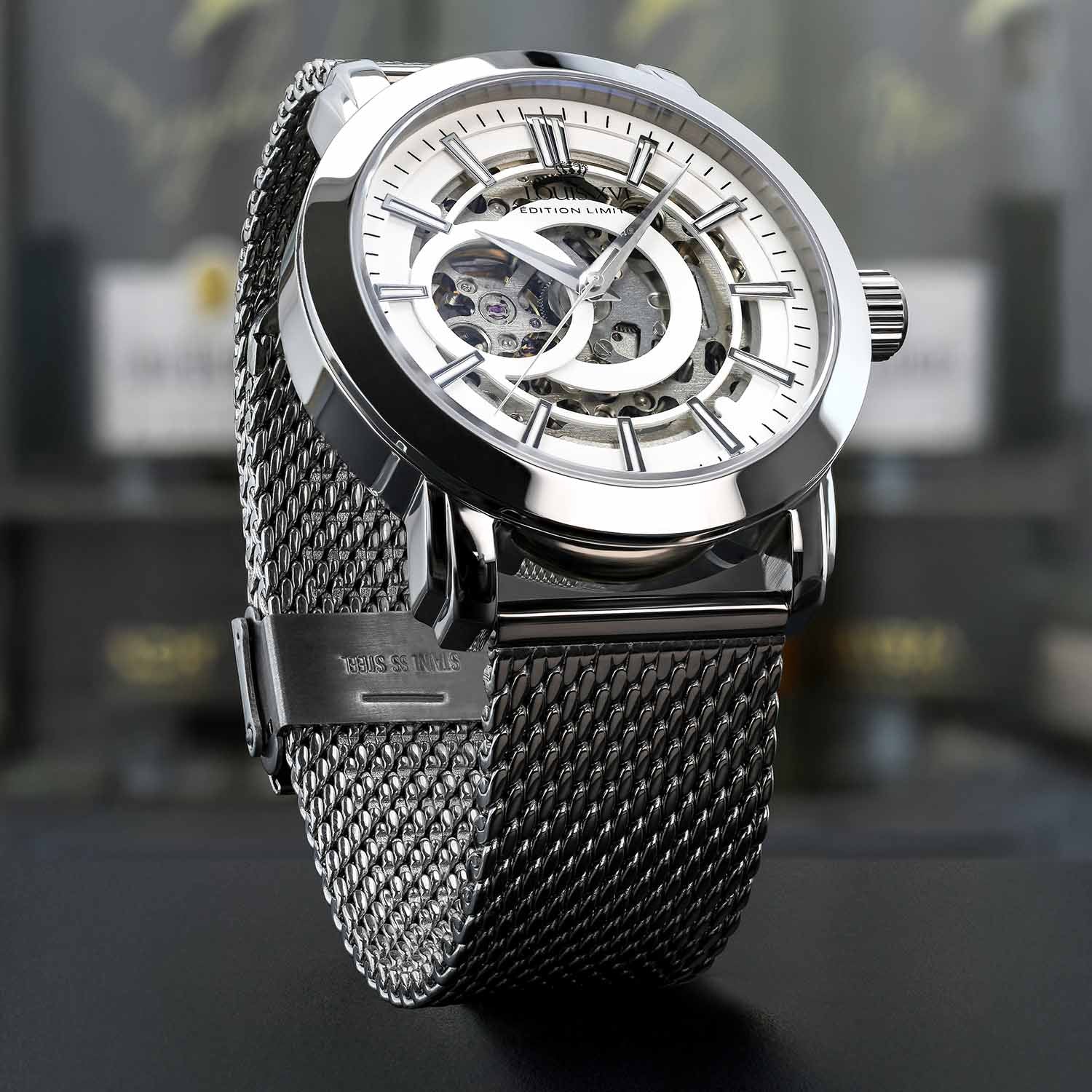 Das skelettierte Zifferblatt ist ein echtes Highlight, das den Blick auf das präzise Uhrwerk im Inneren freigibt. Es verbindet technische Raffinesse mit modernem Design und schafft so eine einzigartige Optik, die jedes Handgelenk zum Blickfang macht. Jede Bewegung des Automatikwerks wird sichtbar – ein kleines Kunstwerk, das die Verbindung von Mechanik und Ästhetik perfekt inszeniert.