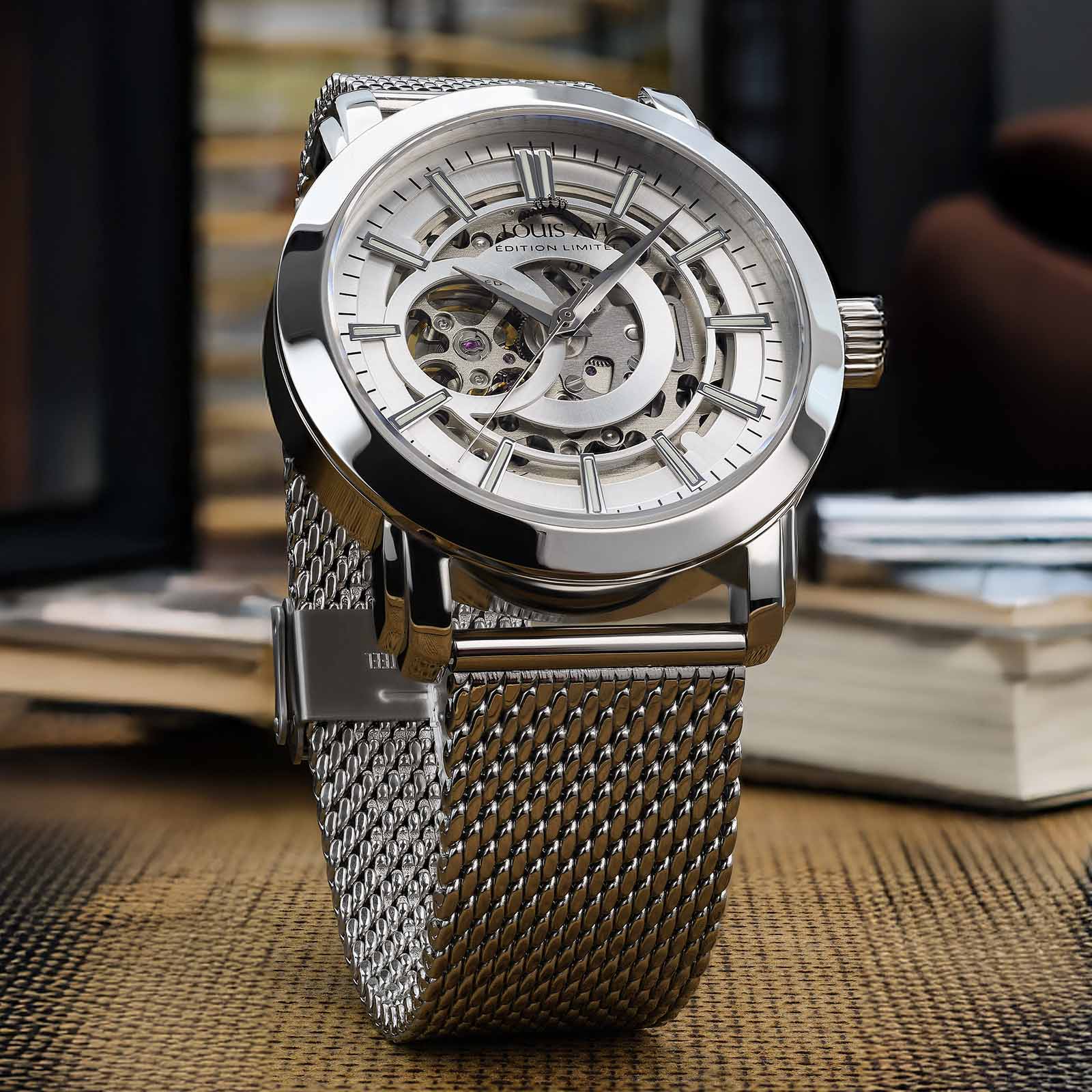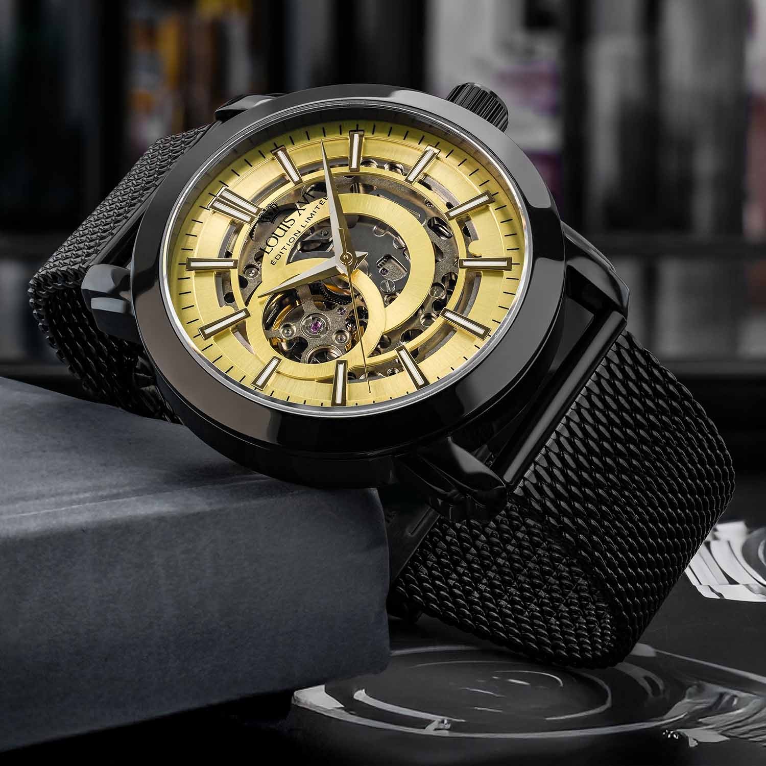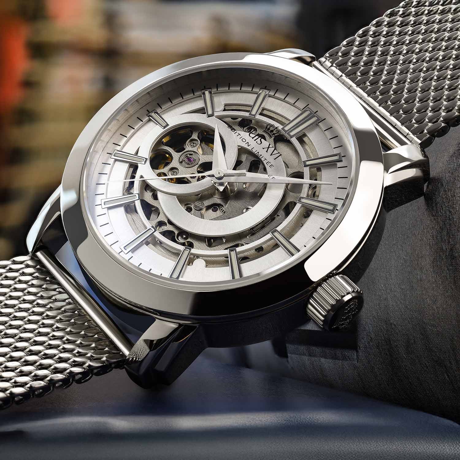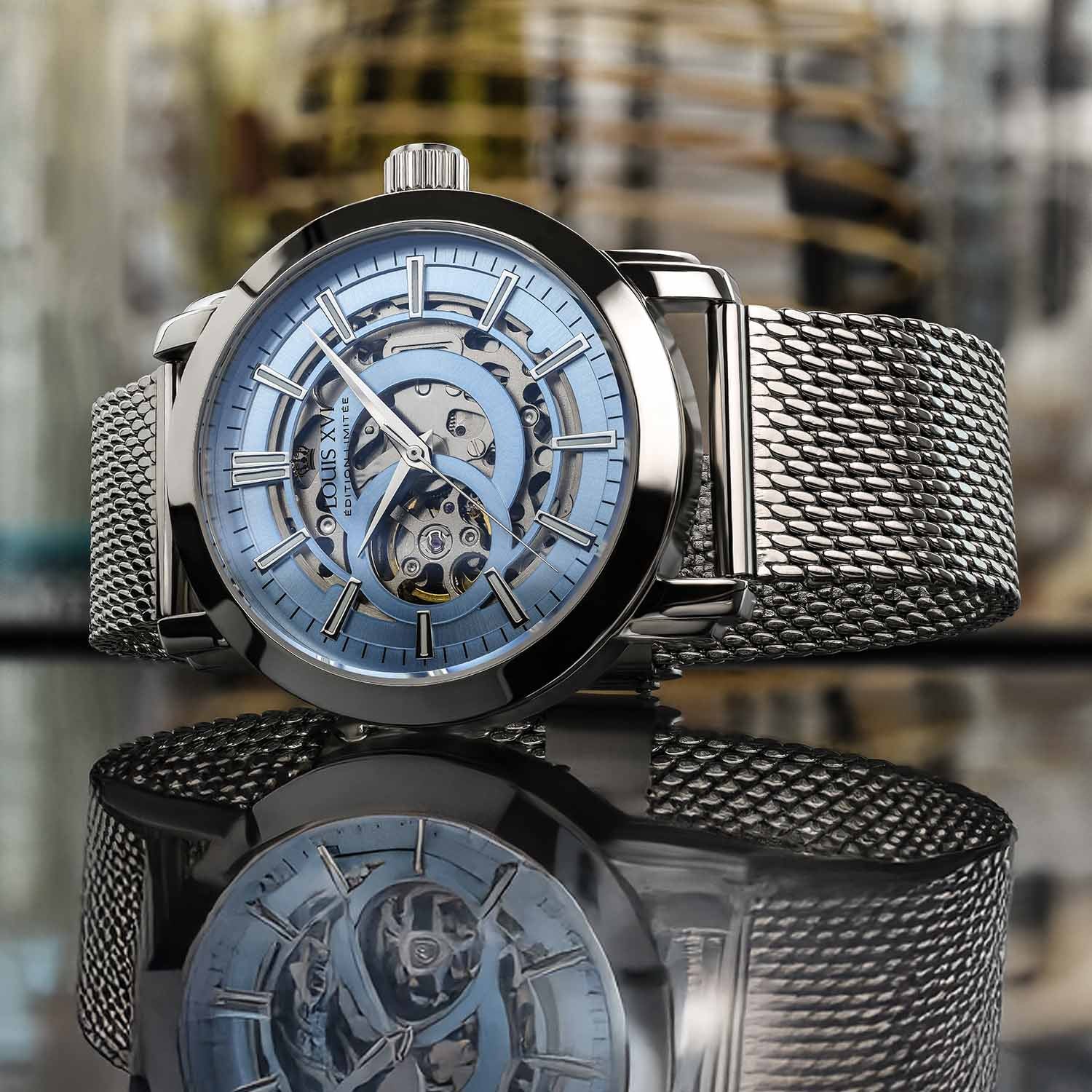 Das skelettierte Zifferblatt ist ein echtes Highlight, das den Blick auf das präzise Uhrwerk im Inneren freigibt. Es verbindet technische Raffinesse mit modernem Design und schafft so eine einzigartige Optik, die jedes Handgelenk zum Blickfang macht. Jede Bewegung des Automatikwerks wird sichtbar – ein kleines Kunstwerk, das die Verbindung von Mechanik und Ästhetik perfekt inszeniert.