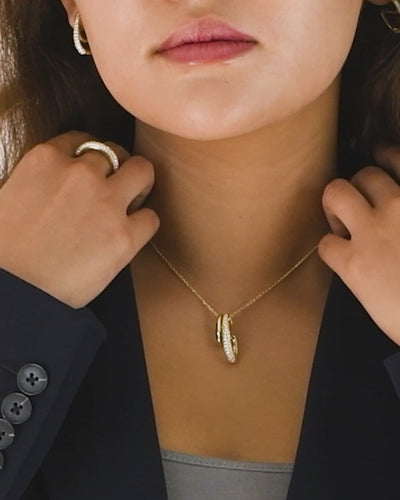 Die Kette aus S925-Sterlingsilber trägt einen 25mm hohen Anhänger, der aus zwei verlängerten Tropfen komponiert ist: ein Element glatt poliert für ruhigen Glow, ein Zirkonia-Pavé-Tropfen für feines Funkeln. Zusammen entsteht ein skulpturaler, moderner Look mit eleganter Leichtigkeit.