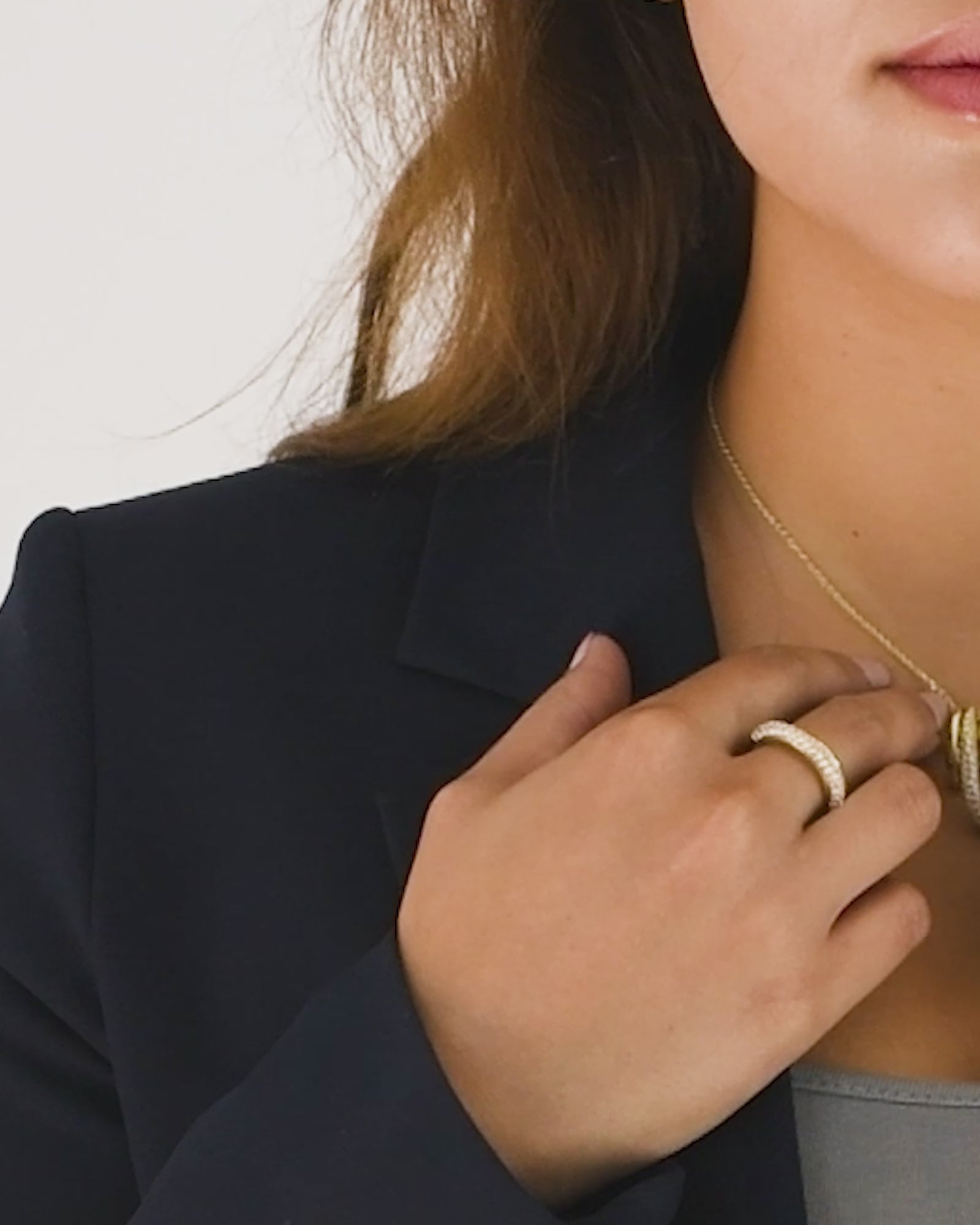Dieser Ring aus S925 Sterlingsilber zeigt eine doppelte Silhouette: eine schlanke Zirkonia-Pavé-Linie mit feinem Funkeln sowie eine glatt polierte Kontur mit ruhigem Glow. Der Ring ist ca. 8mm breit und wirkt so schlank und edel am Finger.