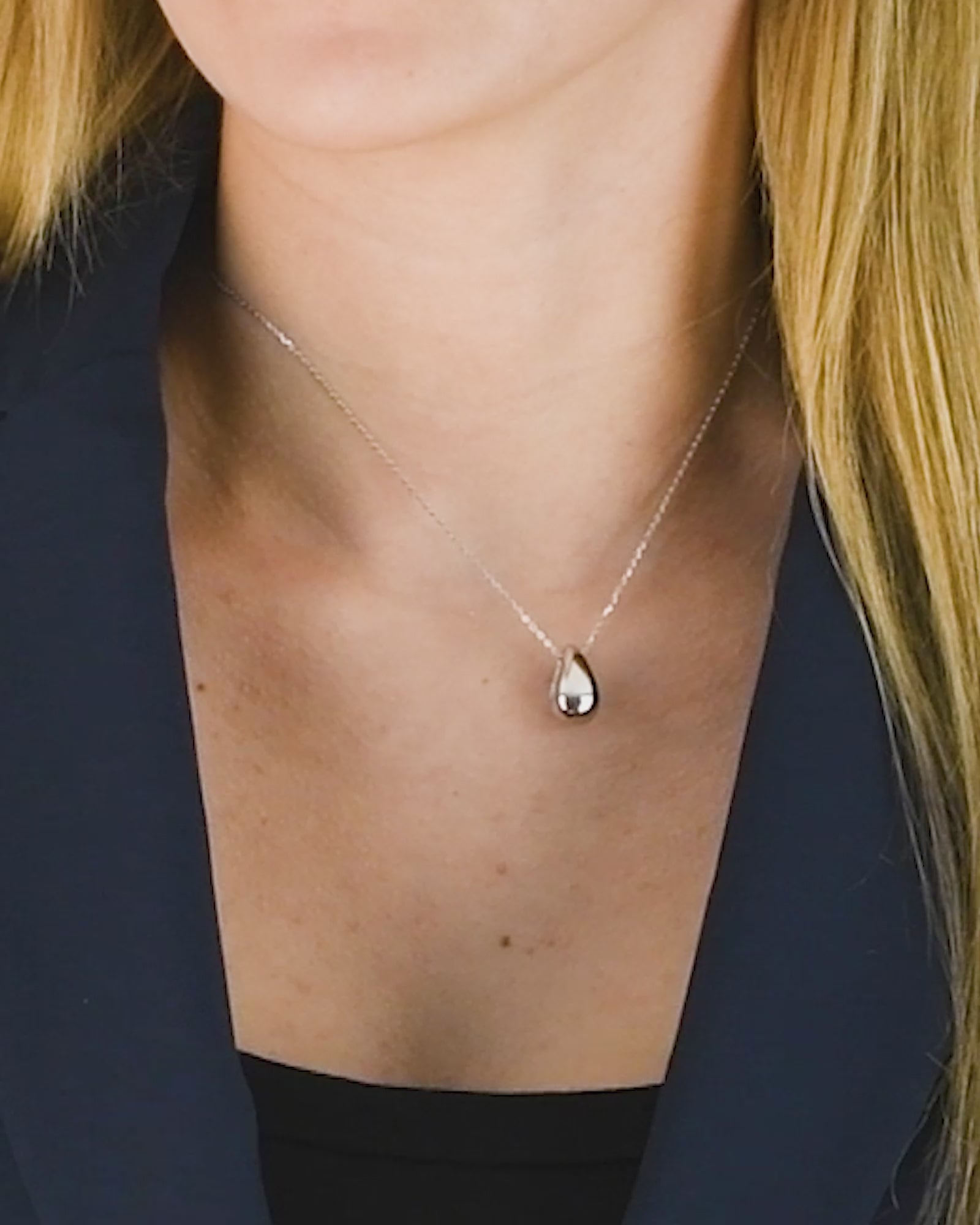 Die Kette aus S925 Sterlingsilber trägt einen 18mm grossen Tropfenanhänger mit seidenmatt gebürsteter Oberfläche. In der Mitte öffnet sich ein tropfenförmiges Fenster, dessen feine Zirkonia-Kontur das Licht elegant einfängt. Die zarte Kette liegt angenehm am Hals und lässt sich von 40 cm auf 45 cm verlängern, so passt sie sich jedem Ausschnitt und jedem Layering an. Erhältlich in zwei Varianten: 14K-Gold-Finish oder Silber (rhodiniert), Sanfter Glanz und feines Funkeln – dezenter Luxus für jeden Tag.