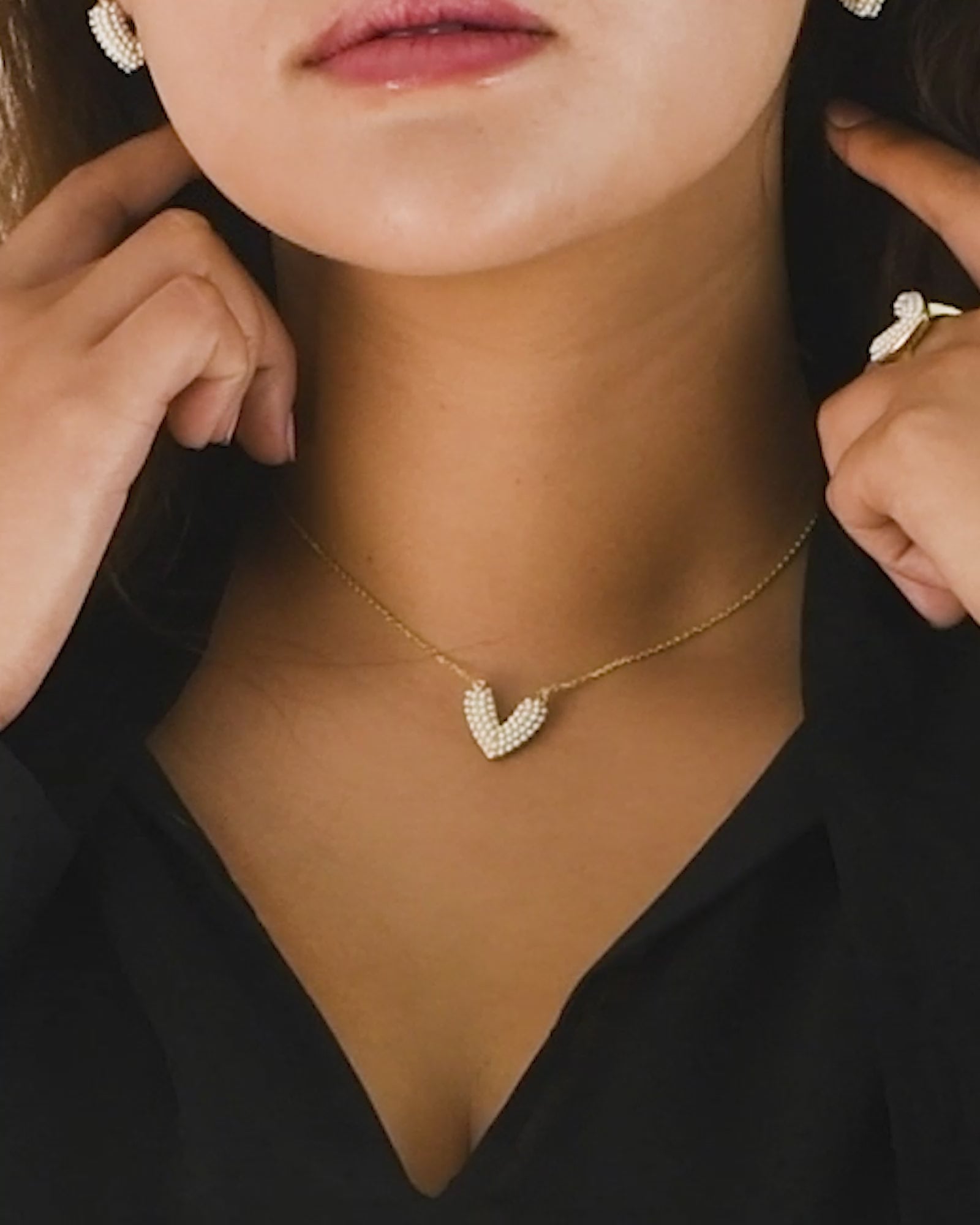 Die Halskette aus S925 Sterlingsilber mit 14-K-Goldbeschichtung trägt einen modern-skulpturalen Herzanhänger, rundum mit feinen, kleinen Perlen. Die dichte Anordnung sorgt für einen ruhigen, edlen Schimmer und die vergoldete Fassung rahmt die Perlen und betont die moderne Herzform.