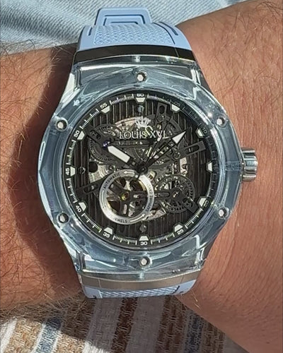 Die La Lumière Ref. 3823 – Baby Blue bringt Frische und Leichtigkeit in die Welt der Uhren. Das aus K9 Glas gefertigte Gehäuse verleiht der Uhr eine fast schwebende Transparenz, während das hellblaue Kautschukarmband einen modernen, dynamischen Kontrast setzt.