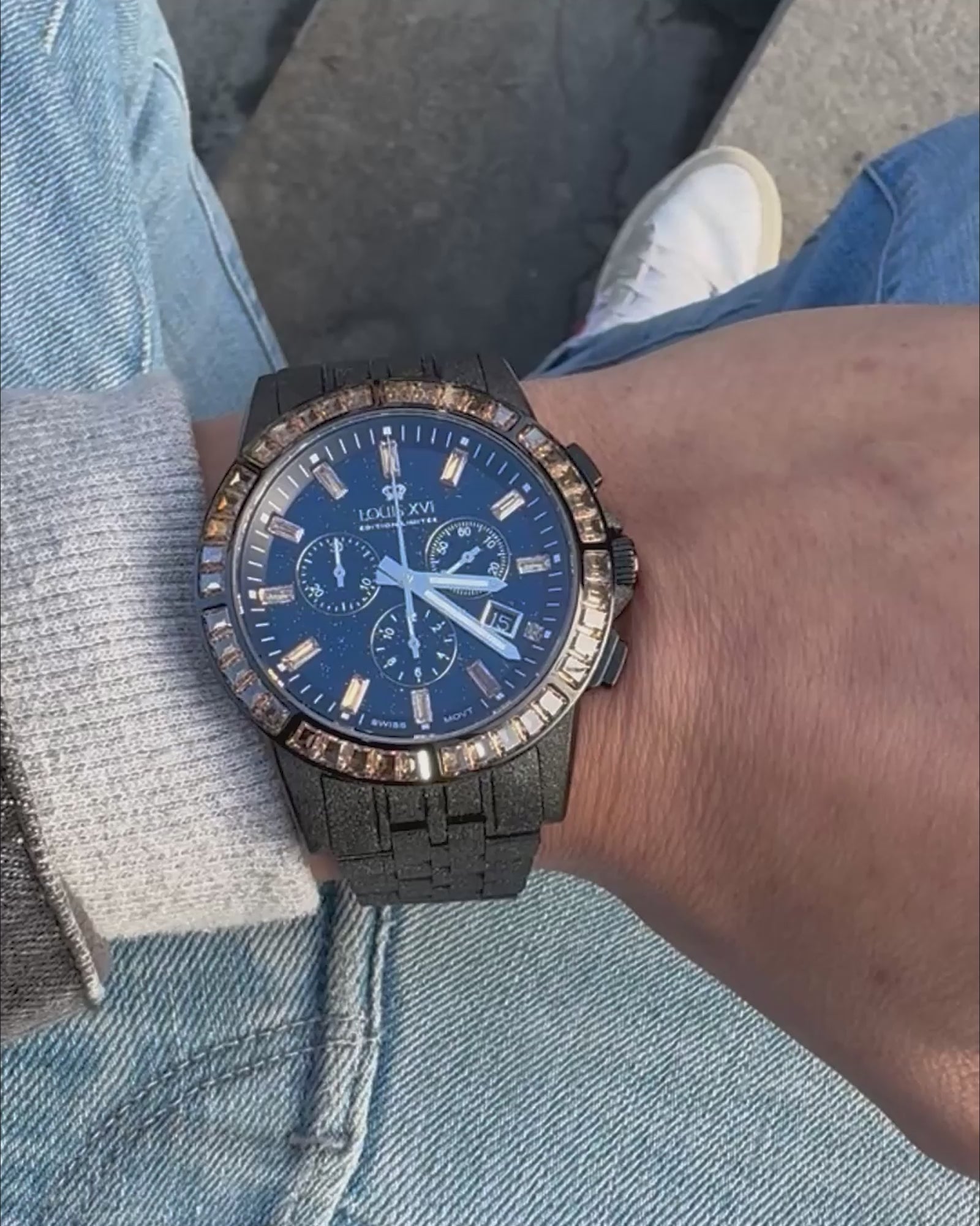 Die Majesté Frosted Iced Out 1183 – Desert Gold Edition ist ein Meisterwerk moderner Uhrmacherkunst. Diese exklusive Uhr kombiniert ein tiefschwarzes frosted PVD-Finish mit funkelnden goldfarbenen Steinen, die dem Modell eine edle und zugleich kraftvolle Ausstrahlung verleihen. Mit ihrer perfekten Mischung aus Eleganz und Funktionalität ist sie ein Must-have für Uhrensammler und stilbewusste Träger.