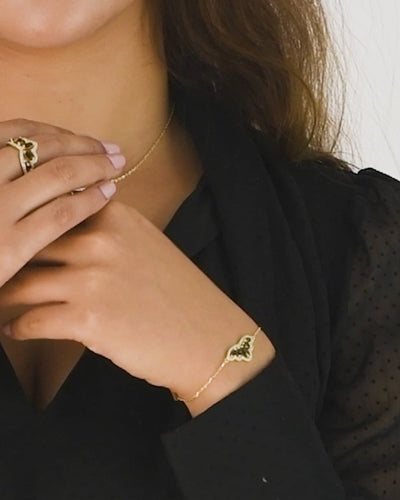 Das Armband aus S925 Sterlingsilber mit 14K-Gold-Finish trägt zentral ein kronenartiges Element: Ein feiner Pavé-Rand zeichnet die Silhouette, schwarze Marquise-Steine setzen die edlen Spitzen. Der Kontrast aus hellem Funkeln und tiefem Schwarz sorgt für prägnante, moderne Eleganz.