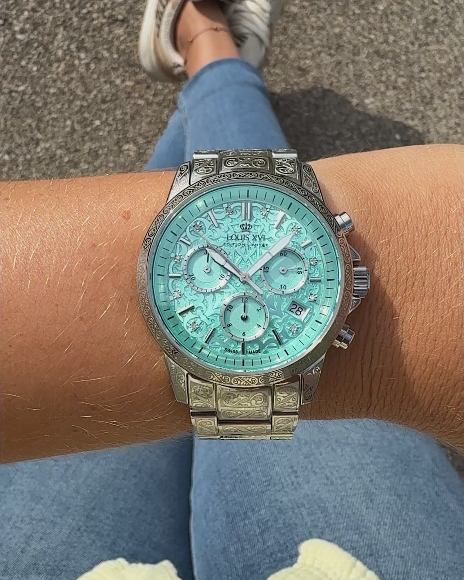 Die Palais Royale Femme Ref. 6025 strahlt pure Frische aus. Das einzigartige Minty Green Zifferblatt bringt eine moderne Leichtigkeit mit sich und verleiht der Uhr einen unverwechselbaren Charakter. In Kombination mit dem fein gravierten silbernen Gehäuse und Armband entsteht ein Look, der gleichzeitig elegant, verspielt und selbstbewusst wirkt.