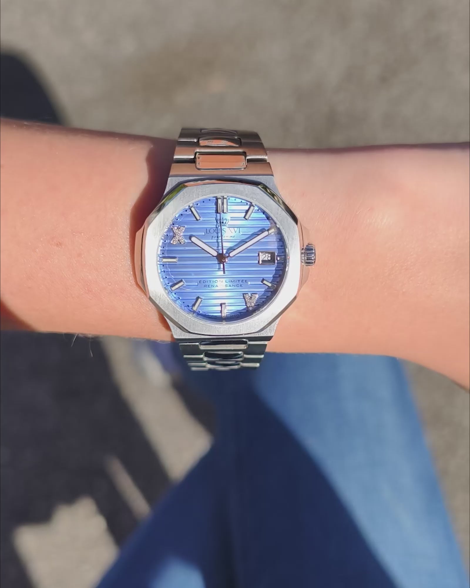 Die Renaissance Femme Ref. 6123 präsentiert sich in einem faszinierenden Frozen Blue – ein Farbton, der wie gefrorenes Licht wirkt und feminine Eleganz mit moderner Frische verbindet. Das strukturierte Zifferblatt fängt jeden Lichtstrahl ein und verleiht der Uhr eine außergewöhnliche Tiefe.
